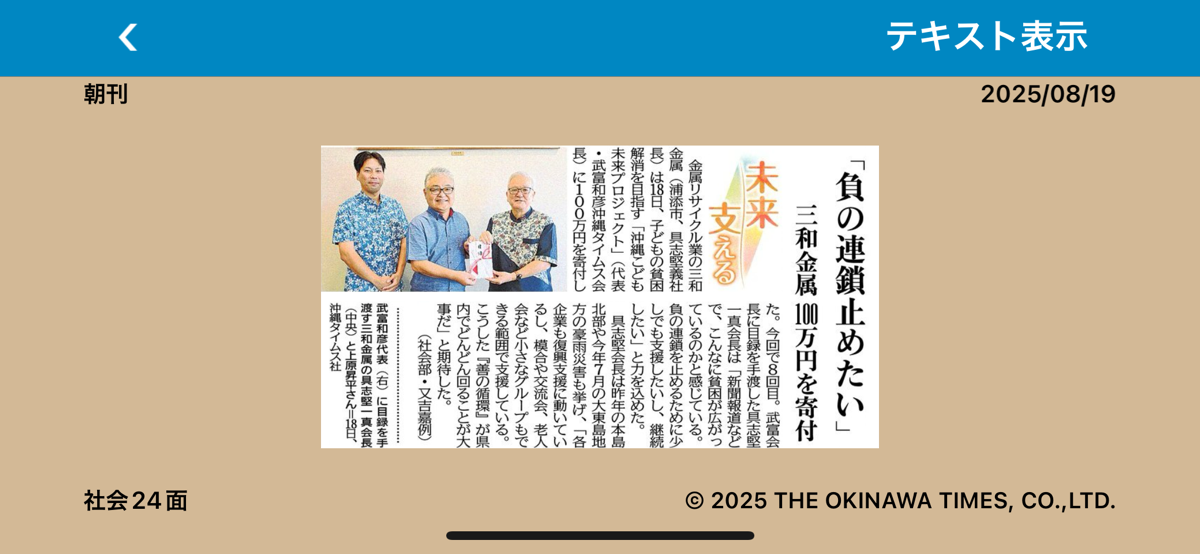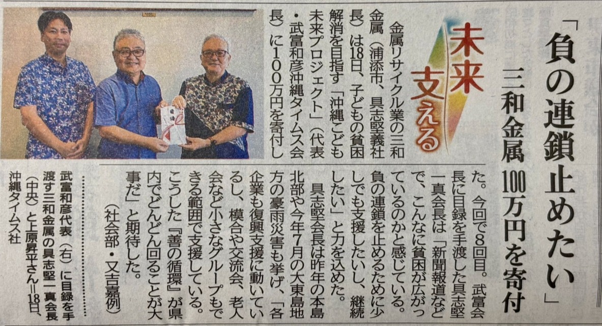 2025年8月1日(金)沖縄子ども未来プロジェクトに100万円の寄付を行いました。